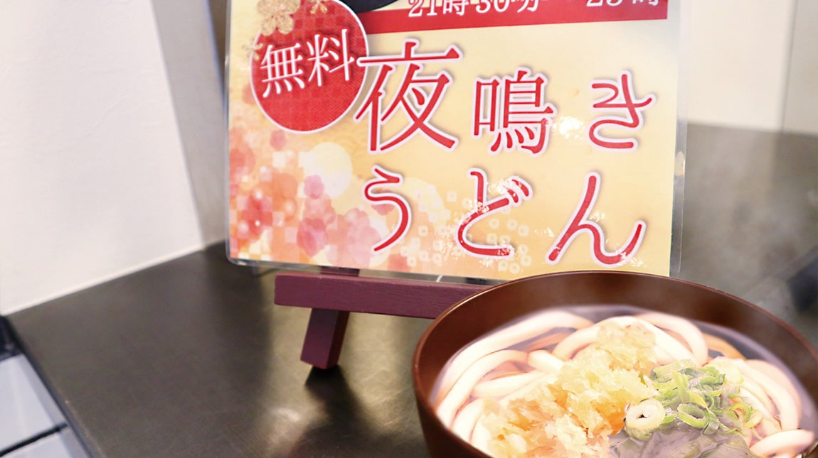 夜食にはハーフサイズの無料・夜鳴きうどんをご用意しております。